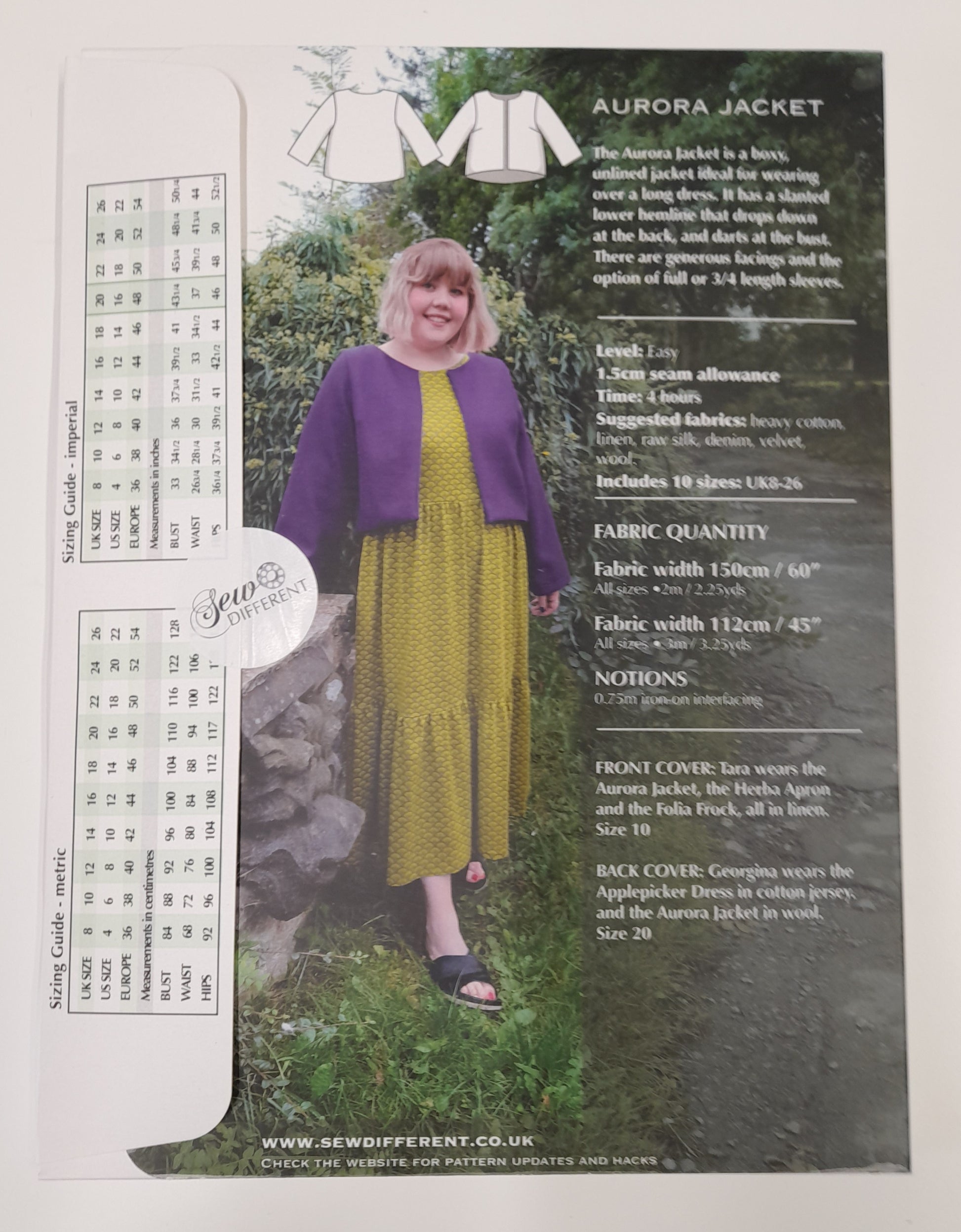 The Aurora Jacket is a boxy, unlined jacket ideal for wearing over a long dress. It has a slanted lower hemline that drops down at the back, and darts at the bust. There are generous facings and the option of full or 3/4 length sleeves.