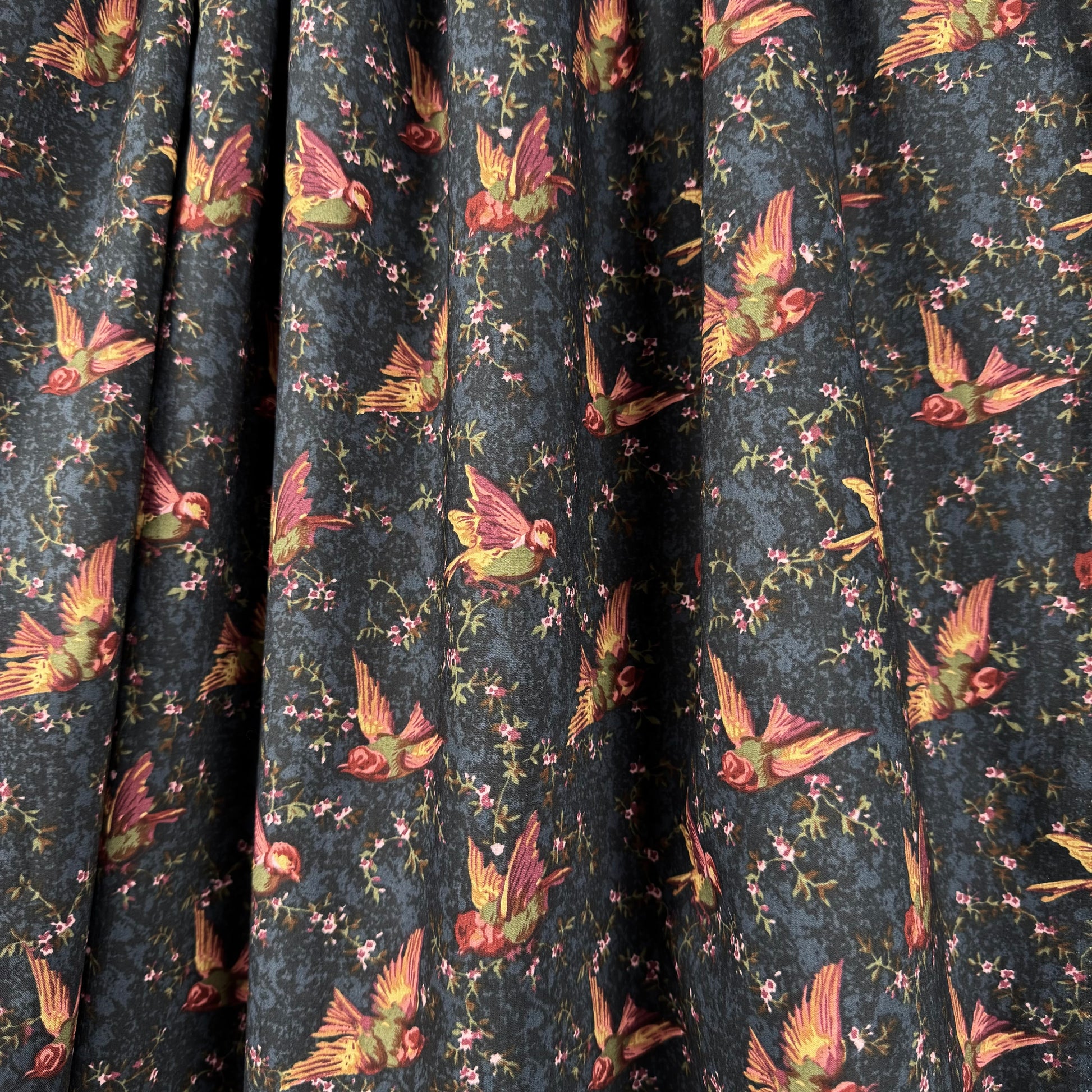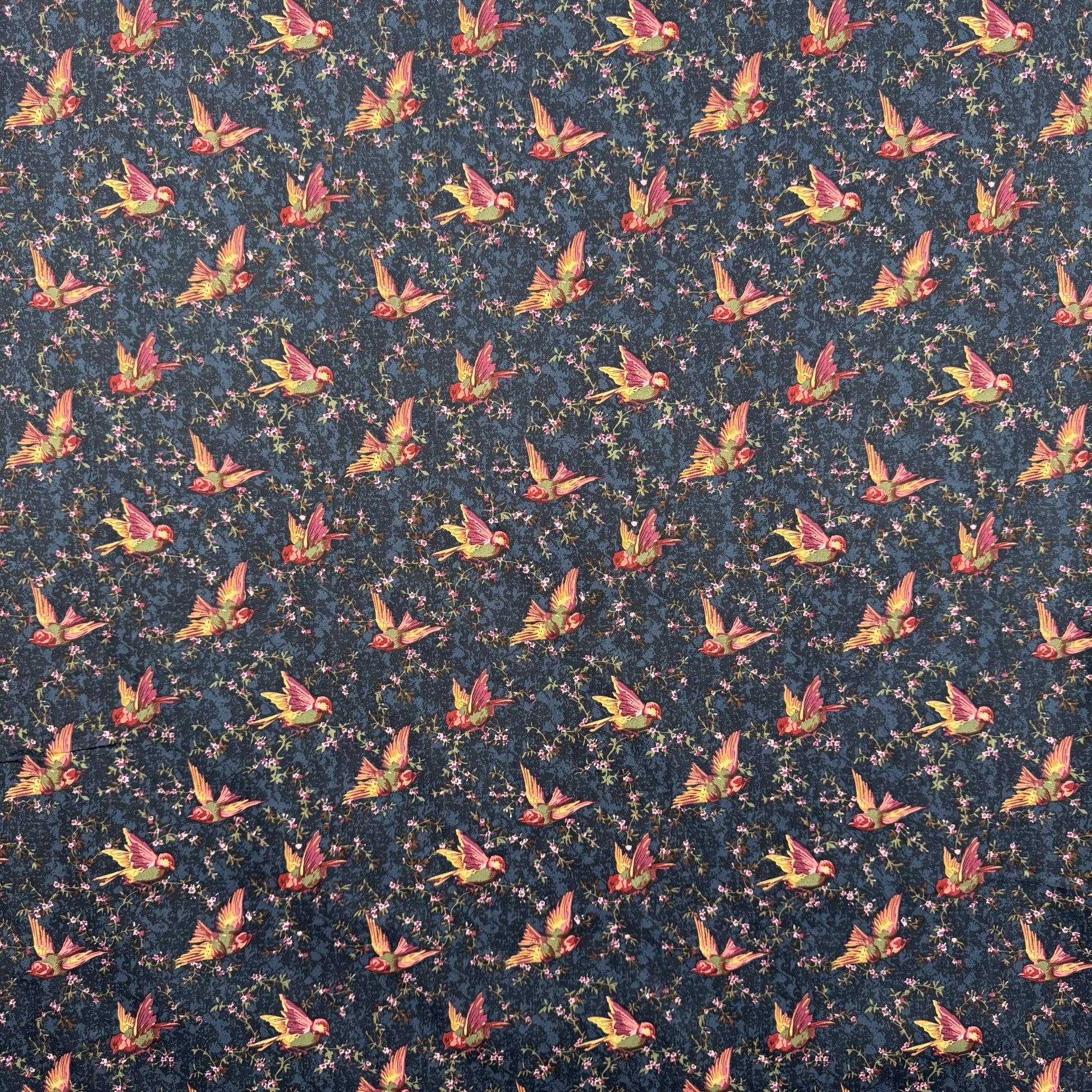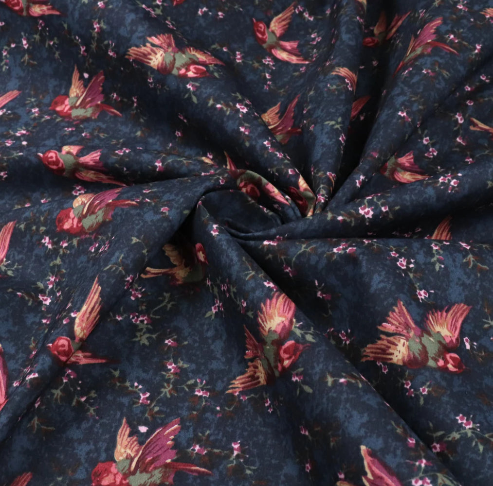 Ex-designer deadstock cotton lawn is heavier than your average cotton lawn and has a similar handle to a cotton poplin. It has a dark navy grey background and covered in foliage and birds with dark pink and green.