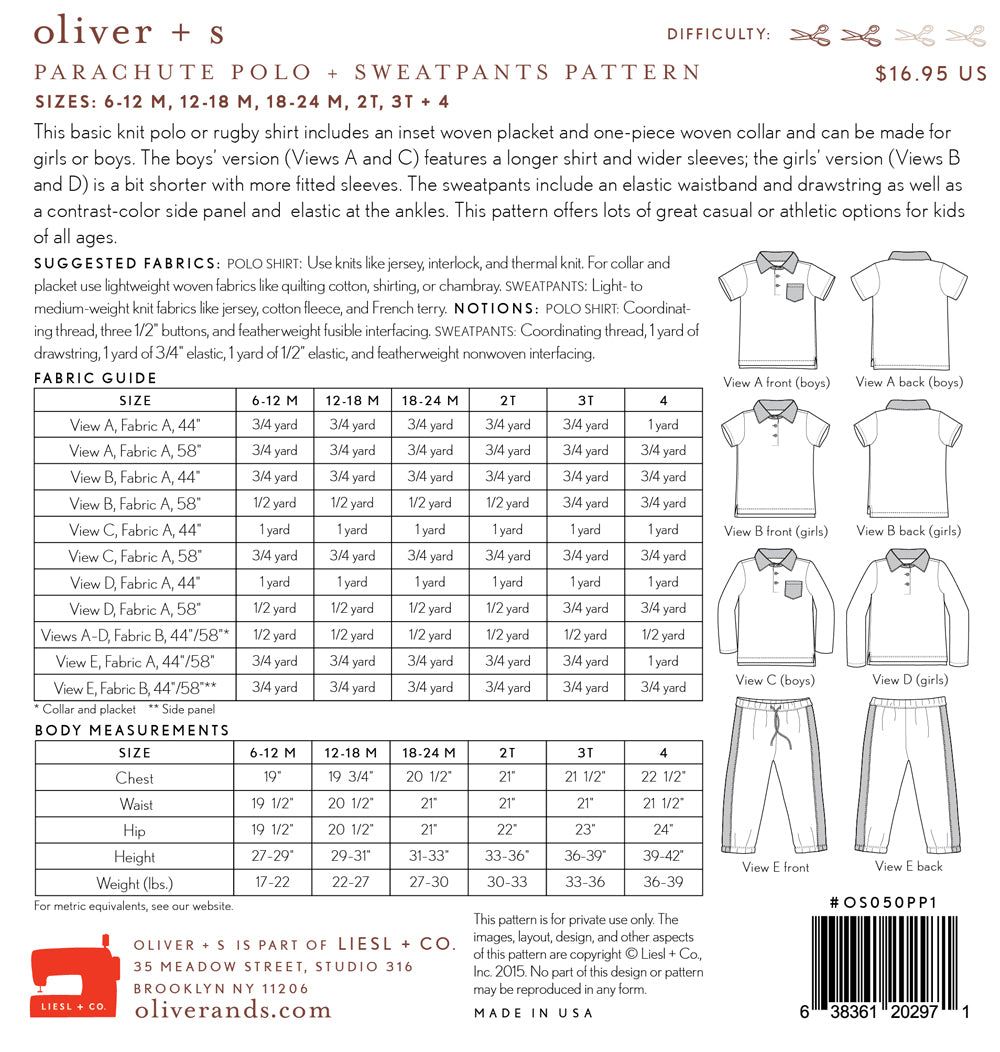This basic knit polo or rugby shirt includes an inset woven placket and one-piece woven collar and can be made for girls or boys. The boys’ version features a longer shirt and wider sleeves; the girls’ version is a bit shorter with more fitted sleeves. The sweatpants include an elastic waistband and drawstring as well as a contrast-color side panel and elastic at the ankles. This pattern offers lots of great casual or athletic options for kids of all ages.
