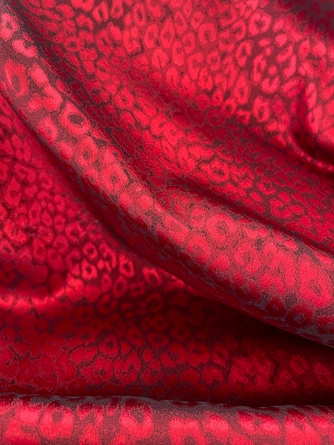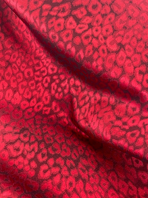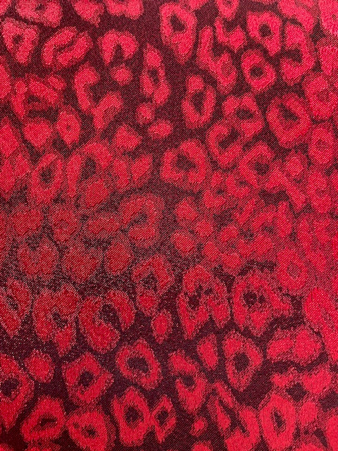 Such a fun fabric, this gorgeous silky smooth fabric, looks different in every light. A bright cherry red on a dark background, creating an abstract animal print design.