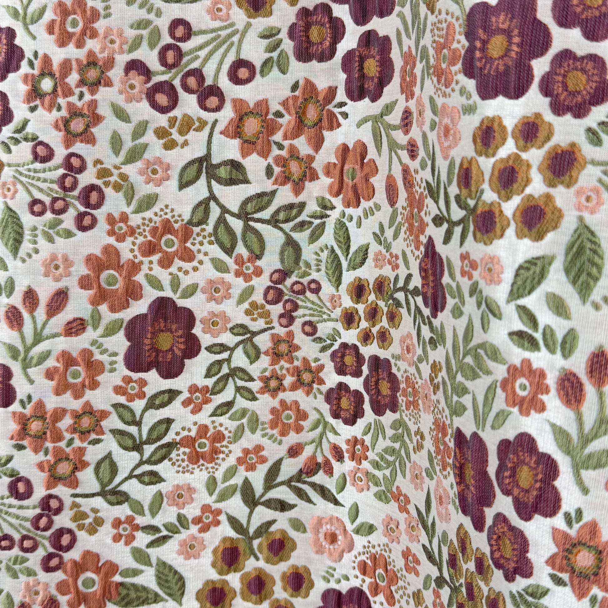 Sage Garden Brocade with spring flowers in muted green, wine, mustard, and dark peach colours on a beige background. Perfect weight for structured garments, jackets, skirts, or vests.