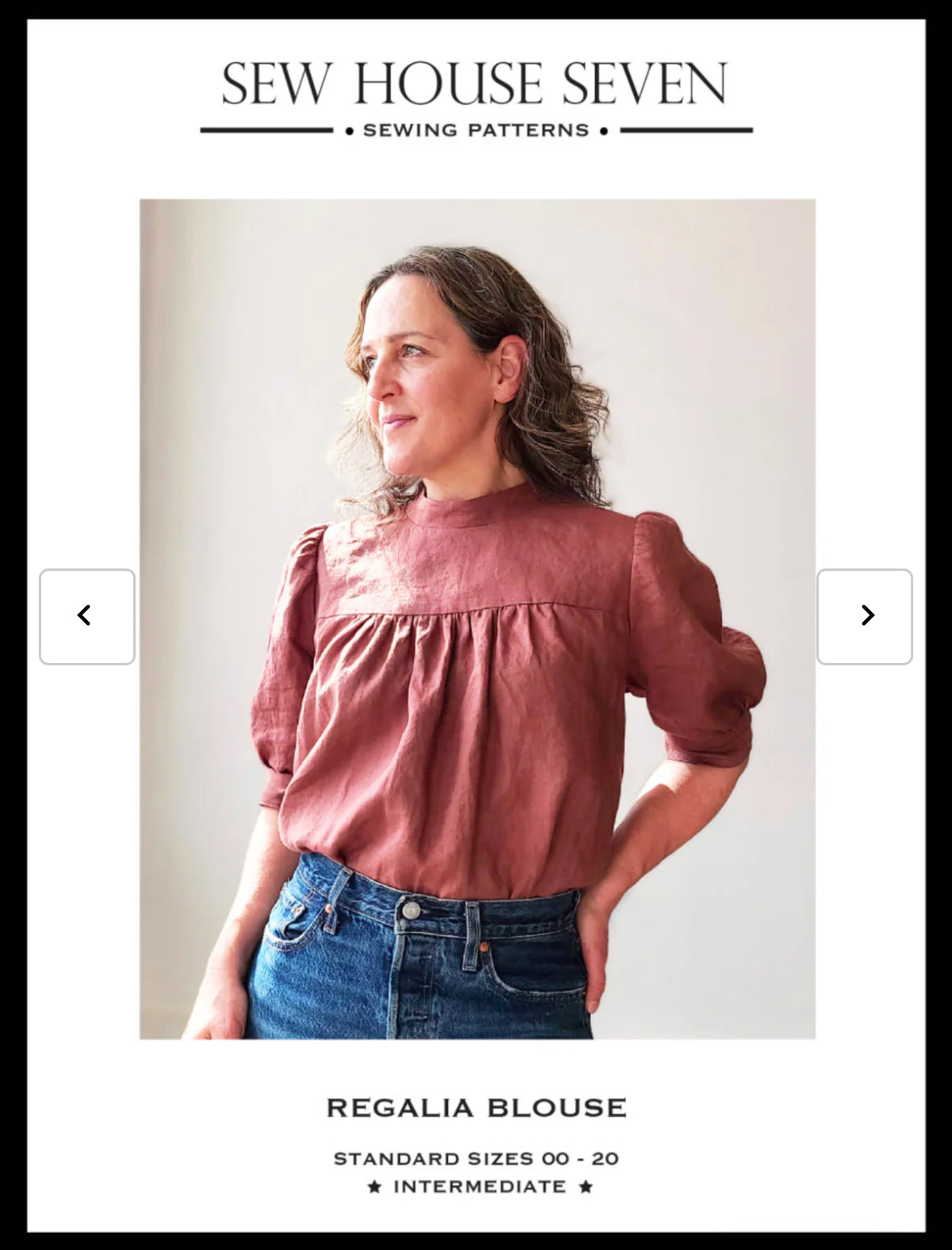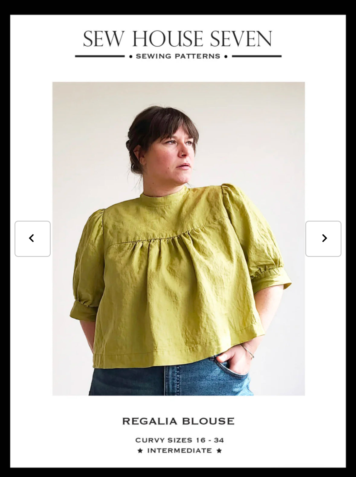 Buy the Regalia Blouse sewing pattern from Sew House Seven. The roomy fit of this stylish gathered blouse makes it so comfortable to wear. It pulls on over the head and ties at a back keyhole opening. It features front and back yokes and a stand-up collar, and there are two lengths and two sleeve designs to mix and match. Choose between a loose and flowy cropped hem to wear with high waist pants and skirts or a slightly longer tuck-in length with an optional waist tie. The long sleeves (A) are gathered at the shoulder and narrow at the wrist, while the short sleeves (B) are gathered at the shoulder and gathered into a cuff that lands just above the elbow. You can also add an optional tulle sleeve head pouf for even more sleeve volume!
