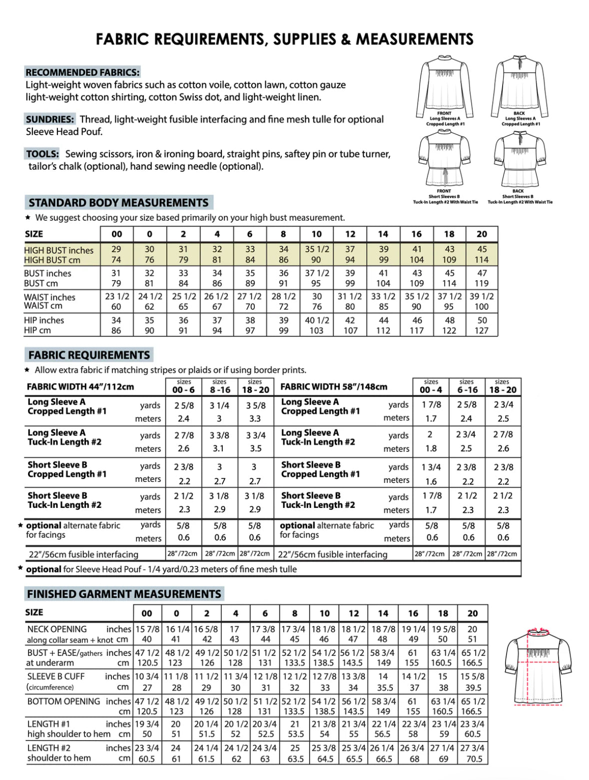 Fabrics: This pattern is designed for lightweight woven fabrics such as cotton voile, cotton lawn and light-weight linens. The muse and initial vision was for Indian block printed voiles, however, we also love it in Swiss dot, chambray, cotton gauze and light weight linens. Just be aware that looser weave fabrics such as gauze and linen will result in a slightly looser fitting blouse.