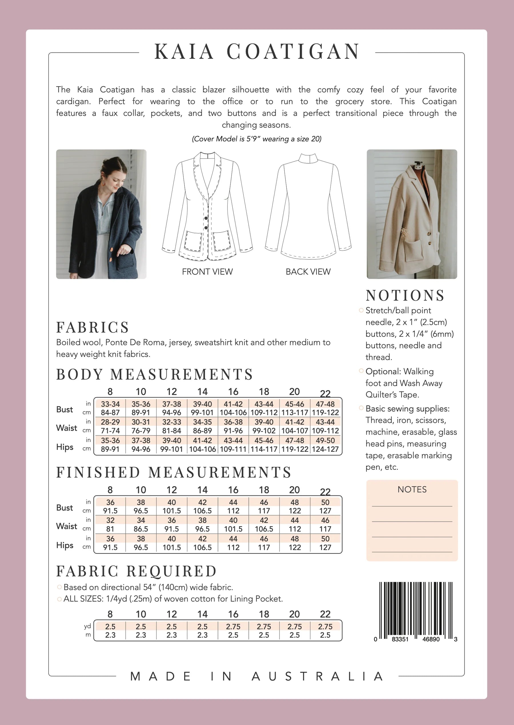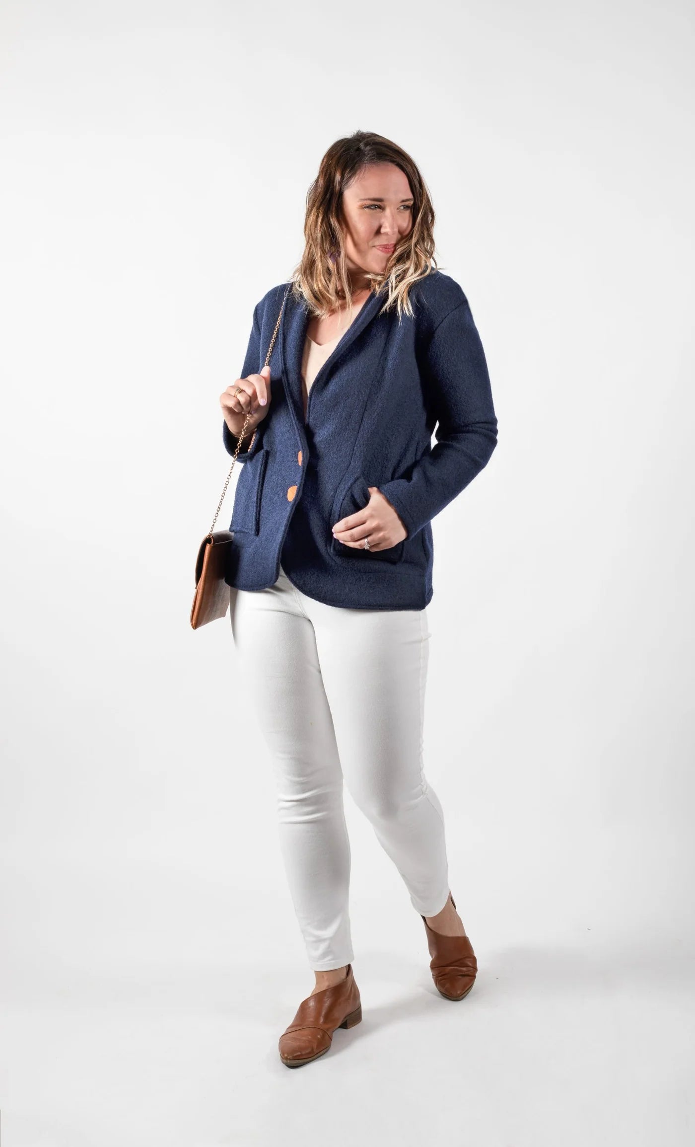 Suggested fabrics: Boiled wool, ponte de roma, jersey, sewatshirt knit, and other medium to heavy weight knit fabrics.