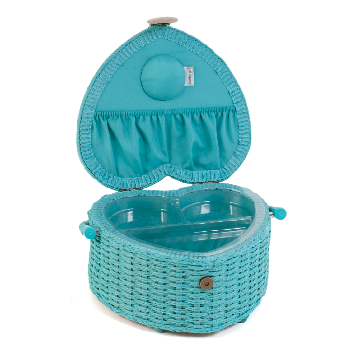 Medium-sized sewing box with lid covered in cotton fabric with appliqué design and press stud fastening. Plastic handle. Hard plastic internal tray with compartments for sewing accessories. Internal pocket and pincushion inside lid. Spot clean only. Item size: (d/w/h) 23 x 25 x 14.7cm.