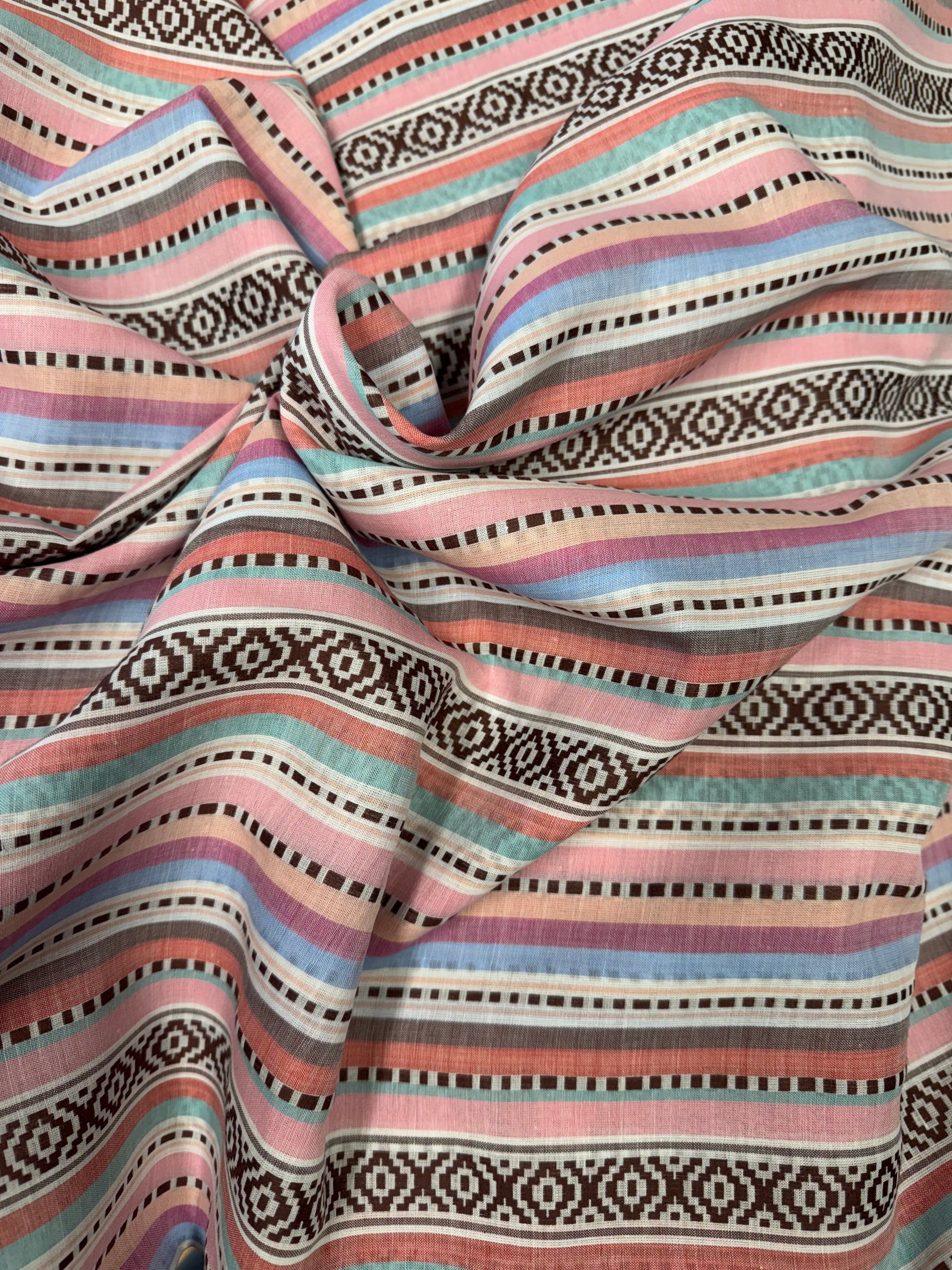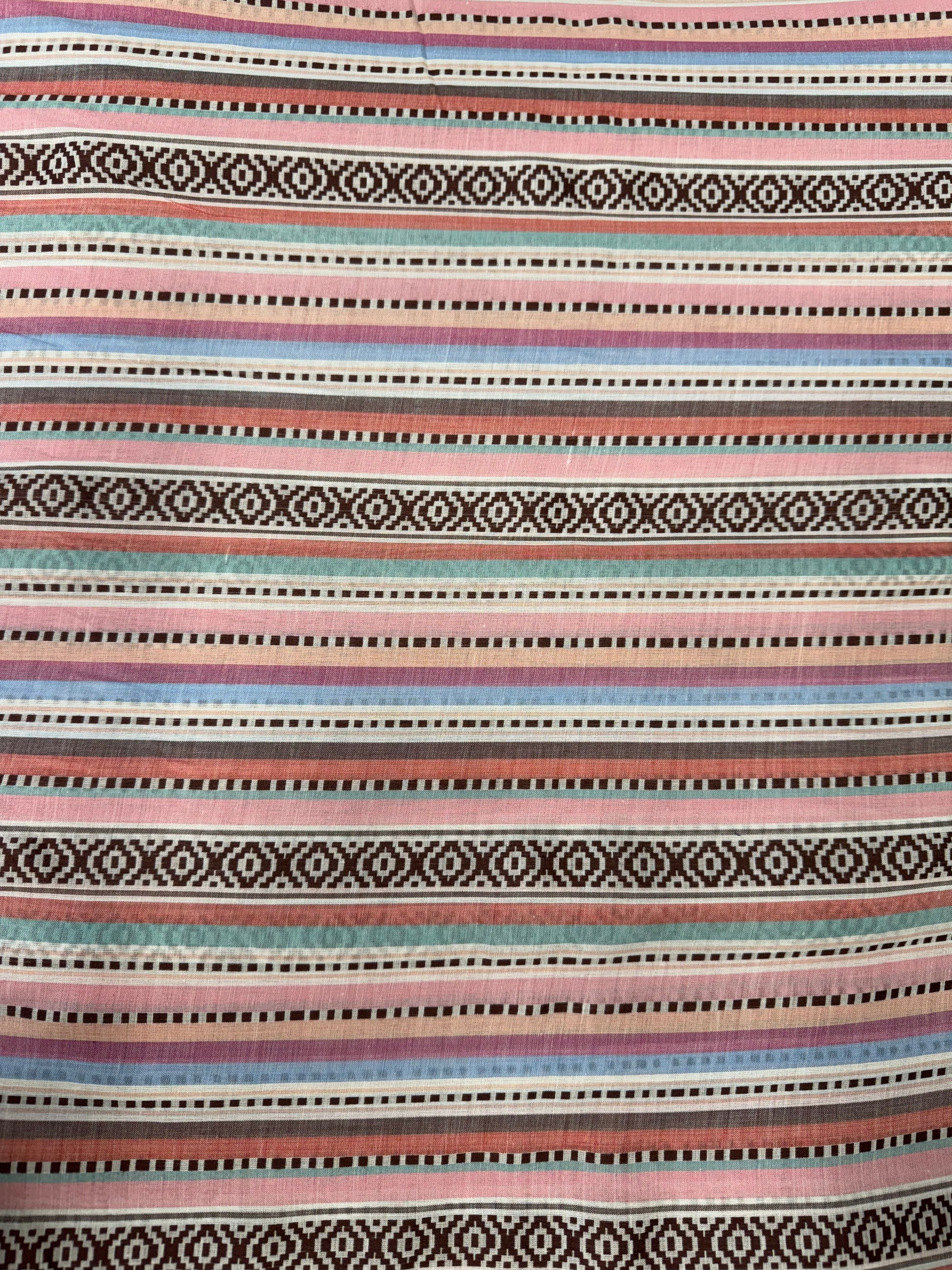Lightweight cotton jacquard multi-coloured striped dressmaking fabric.