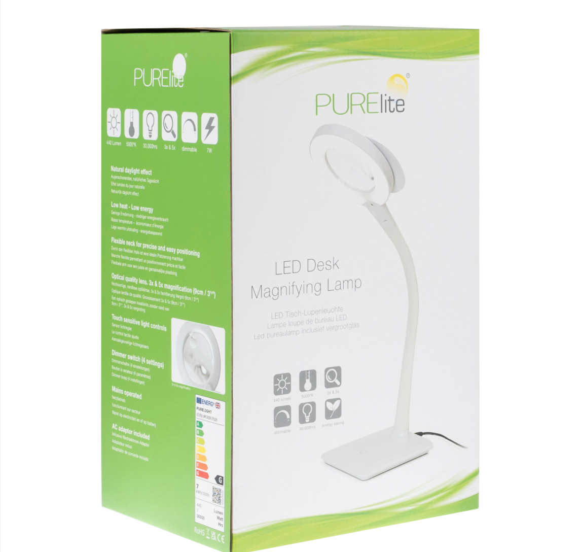 Natural daylight effect. Touch sensitive lighting controls. Low energy. LED technology. Dimmer switch for perfect lighting (4 settings). 9cm optical quality lens. 3 x magnification main lens. 5 x magnification close-up section. Magnifier lens cover. Flexible arm for easy positioning. Mains operated. (AC adapter included). E version of the lamp comes with a European plug.