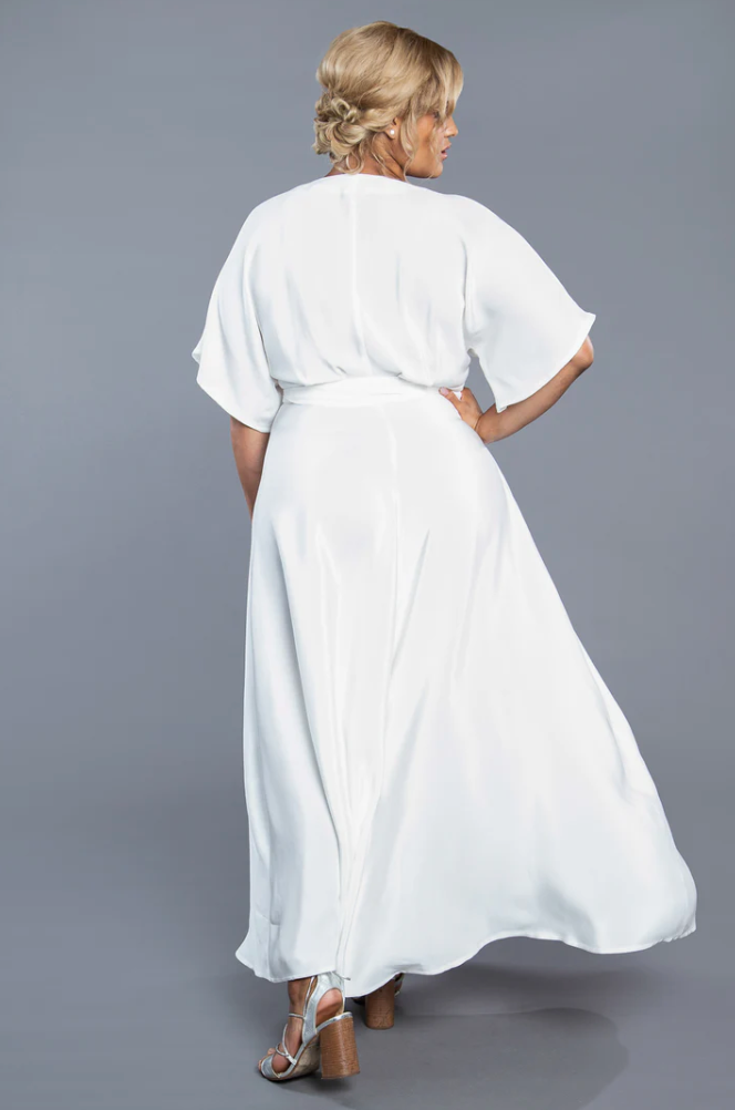 Elodie features a softly flowing bodice, with release pleats under the bust and a dolman style sleeve. Choose between a short sleeve or a longer, more formal option that ends at the elbow. The skirt is swishy and voluminous and comes in three lengths, above the knee, midi or maxi, with optional patch pockets."