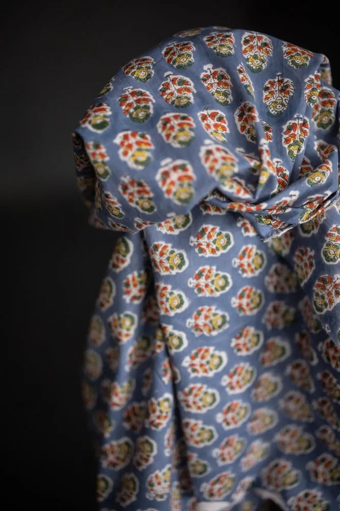 A cheery and pretty Indian screenprint in tones of green, orange and yellow.