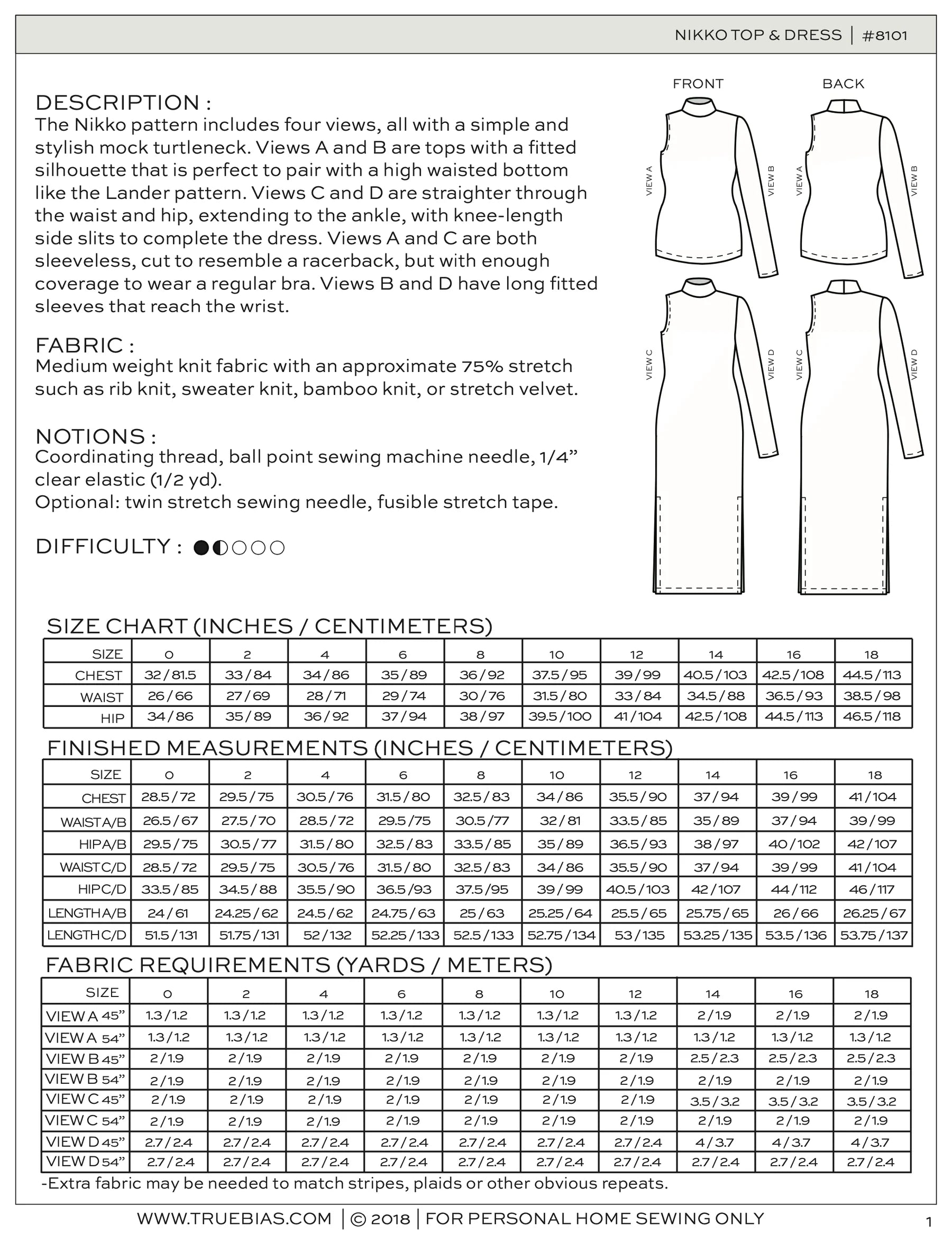 Suggested fabrics: Medium weight knit fabric with approx. 75% stretch such as rib knit, sweater knit, bamboo knit, or stretch velvet.