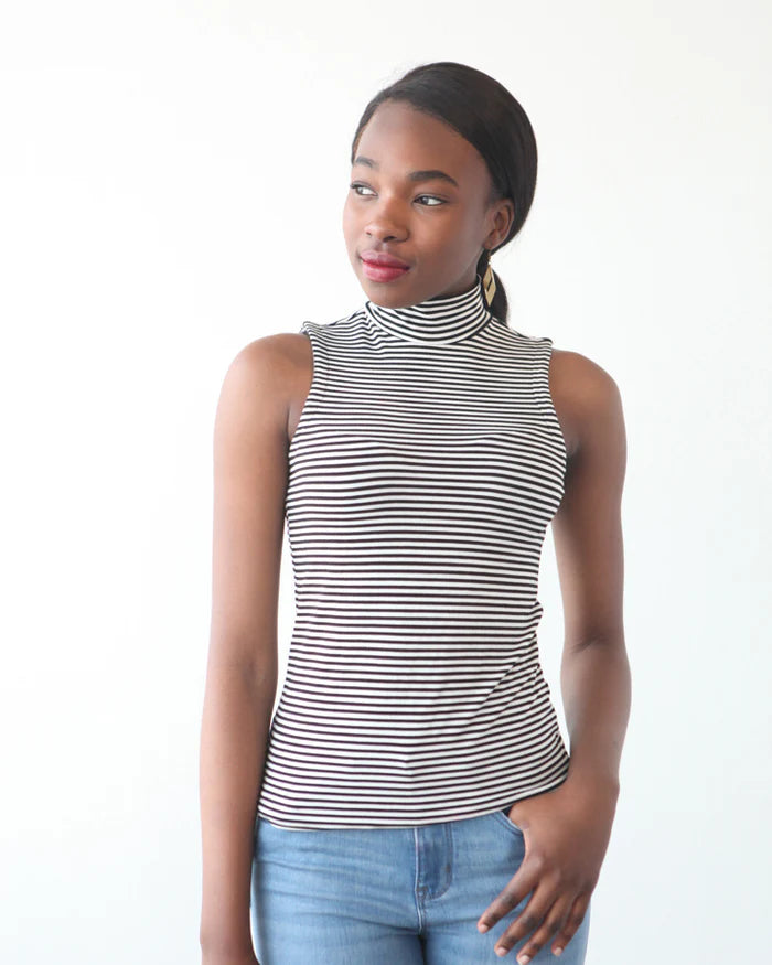 The Nikko pattern includes four views, all with a simple and stylish mock turtleneck. Views A and B are tops with a fitted silhouette that are perfect to pair with high waisted trousers. Views C and D are dresses that extend to the ankle, with knee-length side slits. Views A and C are both sleeveless, cut to resemble a racerback, but with enough coverage to wear a regular bra. Views B and D have long fitted sleeves that reach the wrist.