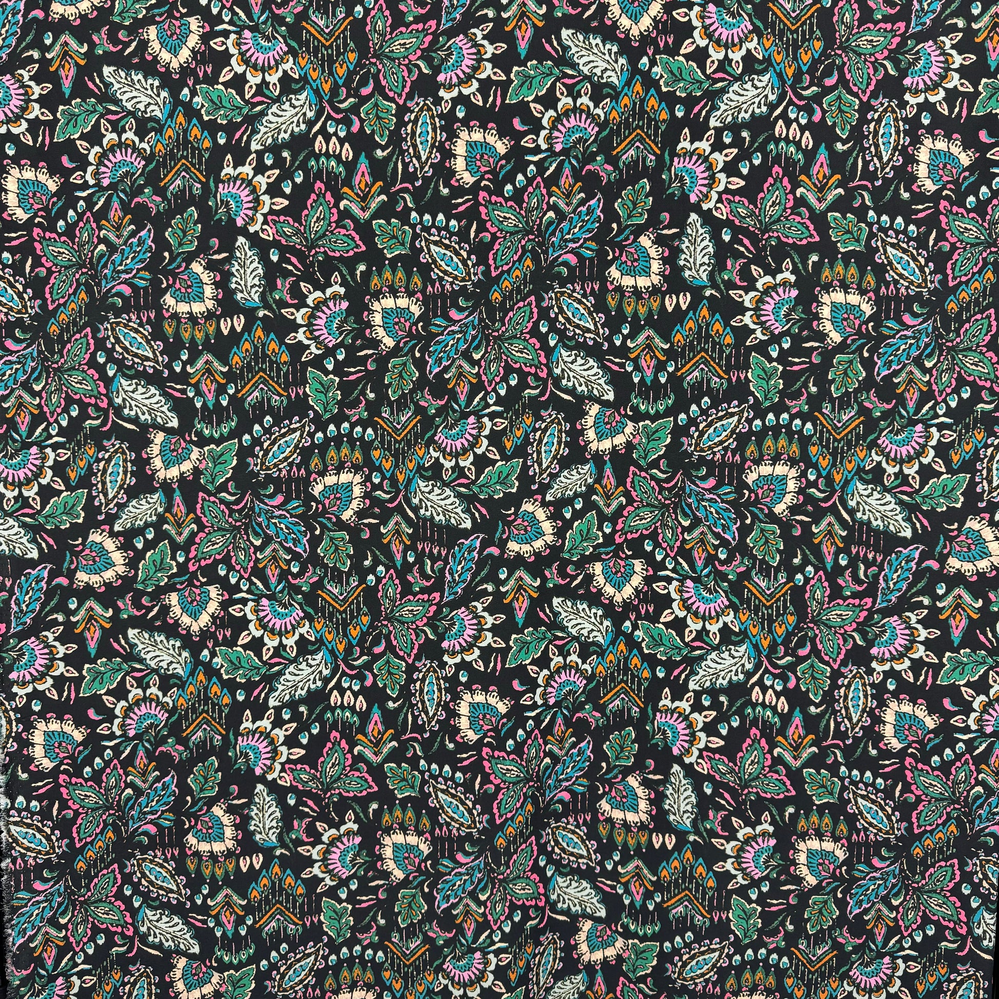 This lightweight satin-like polyester feature a multicoloured stamp style floral design that emulates a paisley. This would be perfect for lightweight dressmaking or lining. It has a very subtle sheen.